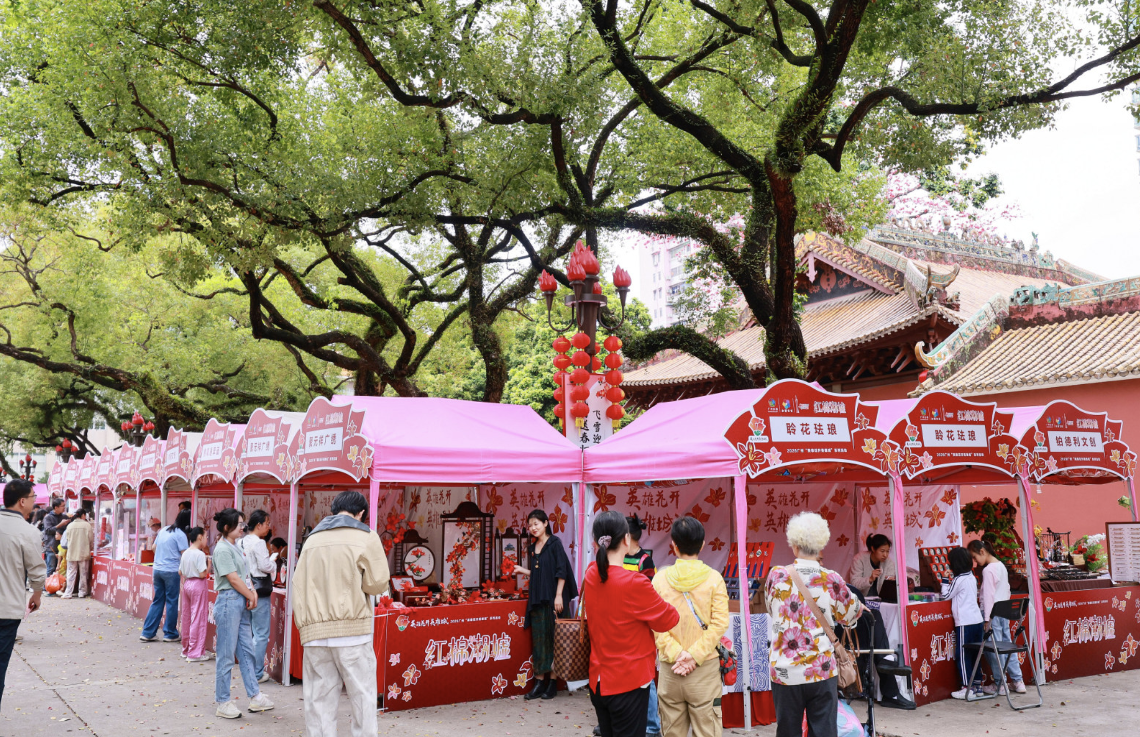 今年红棉潮墟以百年农讲所为主场,现场布置深度融合农讲所地标及文化属性,以红墙、木棉树、大闸门、广州少儿图书馆(20世纪六七十年代是农讲所旧址陈列馆)等元素,打造网红打卡装置,构建“文化+旅游+商业”三位一体的沉浸式体验空间。潮墟不仅是文创市集,更是红色文化的生活化表达,当市民游客在红墙下拍照打卡、在木棉树下驻足停留,红色基因便在不经意间融入日常。