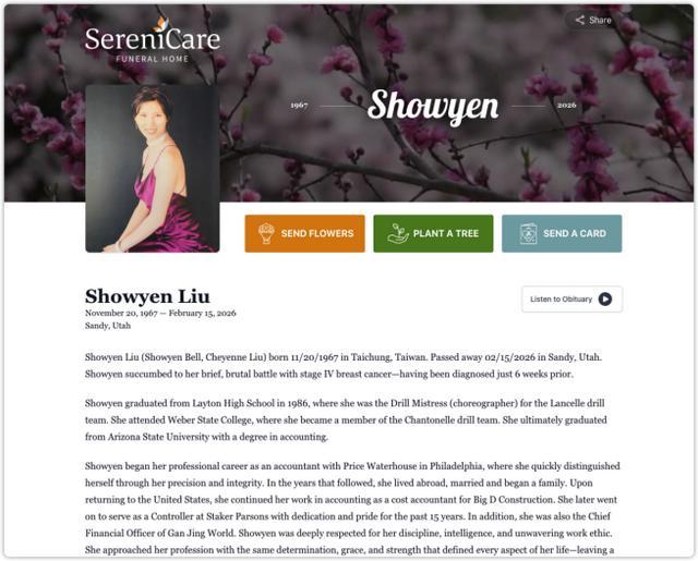 根据讣告,刘晓燕(Showyen Liu,又名Showyen Bell、Cheyenne Liu)1967年11月20日出生于中国台湾省台中市,2026年2月15日在美国犹他州桑迪市病故。她在确诊乳腺癌四期仅六周后不幸离世。