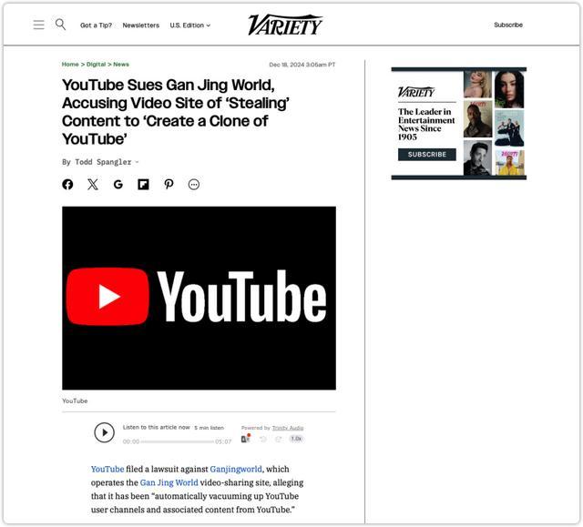 2024年12月18日,美国顶级娱乐杂志《综艺》(Variety)网站报道,视频网站油管(YouTube)在美国加利福尼亚州最高法院对“干净世界”提起诉讼,指控其大量复制油管的功能和整体设计,系统性、规模化抓取并转载油管内容,涉嫌构成不正当竞争及侵权行为,并违反相关服务条款及加利福尼亚州《不正当竞争法》。